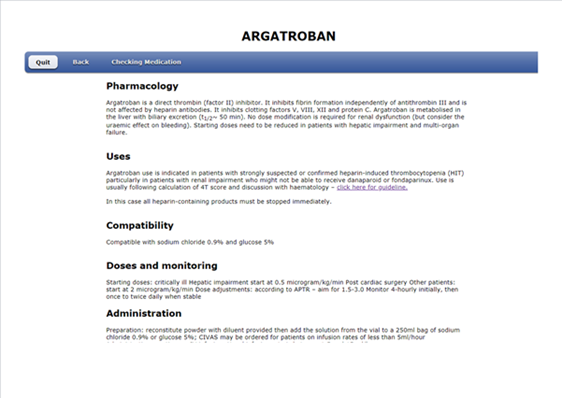 Argatroban is hepatically cleared with t1/2 of 50 mins. It is safe to use in renal failure but if there is hepatic dysfunction a dose reduction is required (usually around 75%). The protocol is available on metavision & accessed via the “Help & Info” tab shown below: