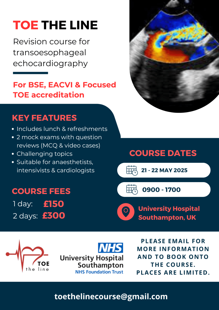 The consultants at UHS run a transoesophageal echocardiography revision course aimed at helping people pass the exams. Future dates are advertised by ACTACC usually here
